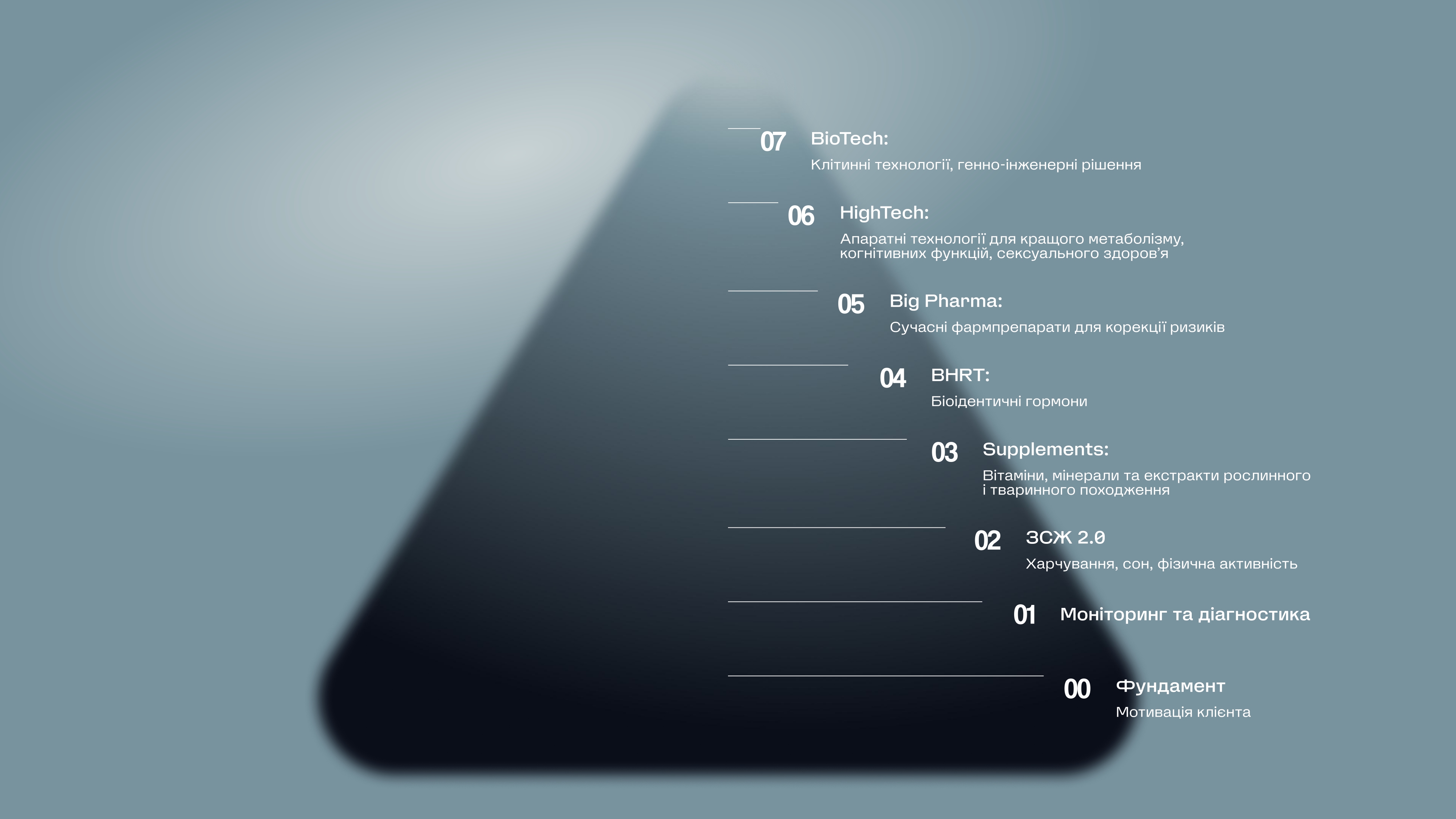 На цій основі створюються персональні треки: корекція сну й ритмів відновлення, рекомендації щодо харчування, індивідуально підібрана нутрицевтика з чіткою ціллю «енергія вранці – відновлення вночі», за потреби – гормональний баланс через BHRT (біоідентичну гормональну терапію), а також інструменти відновлення, що працюють із мозком, метаболізмом та варіабельністю серцевого ритму.