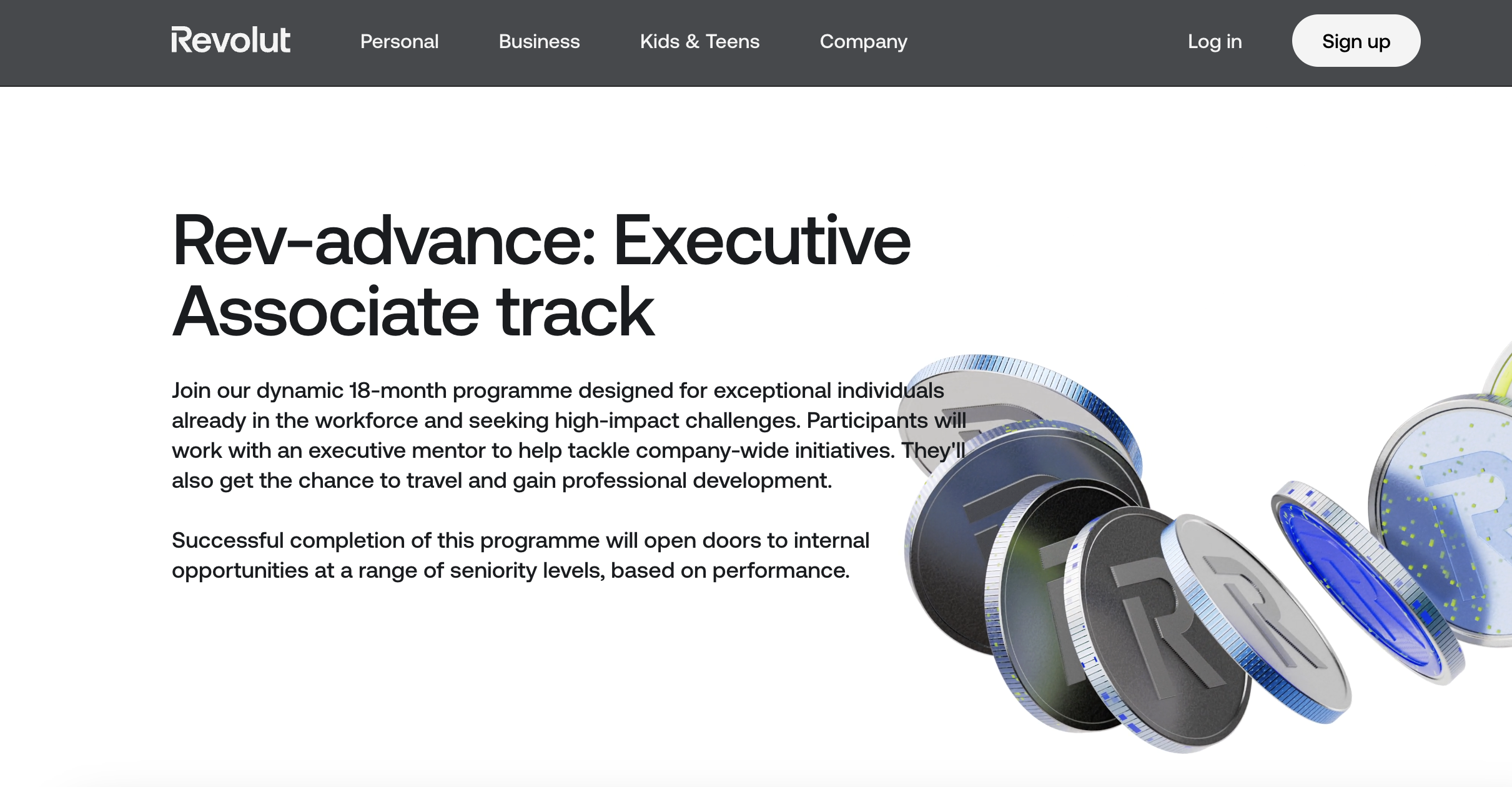 У Revolut діє програма Founder’s Associate, створена для того, щоб допомагати топменеджерам опрацьовувати ініціативи на рівні всієї компанії та масштабувати ключові процеси