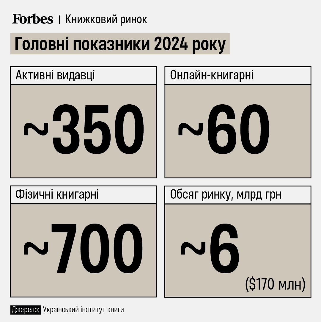 У 2023 році цей показник складав 41%, а у 2024-му вже 45% книжок продавалося в магазинах. Кількість книгарень зросла з 422 (вересень 2023-го) до 461 (лютий 2024-го). Лідери ринку демонструють разючі результати: «Книгарня Є» збільшила виторг до 1,04 млрд грн, відкривши 22 нові магазини. Виторг «Книголенду» в першому півріччі 2025-го збільшився на 83%.