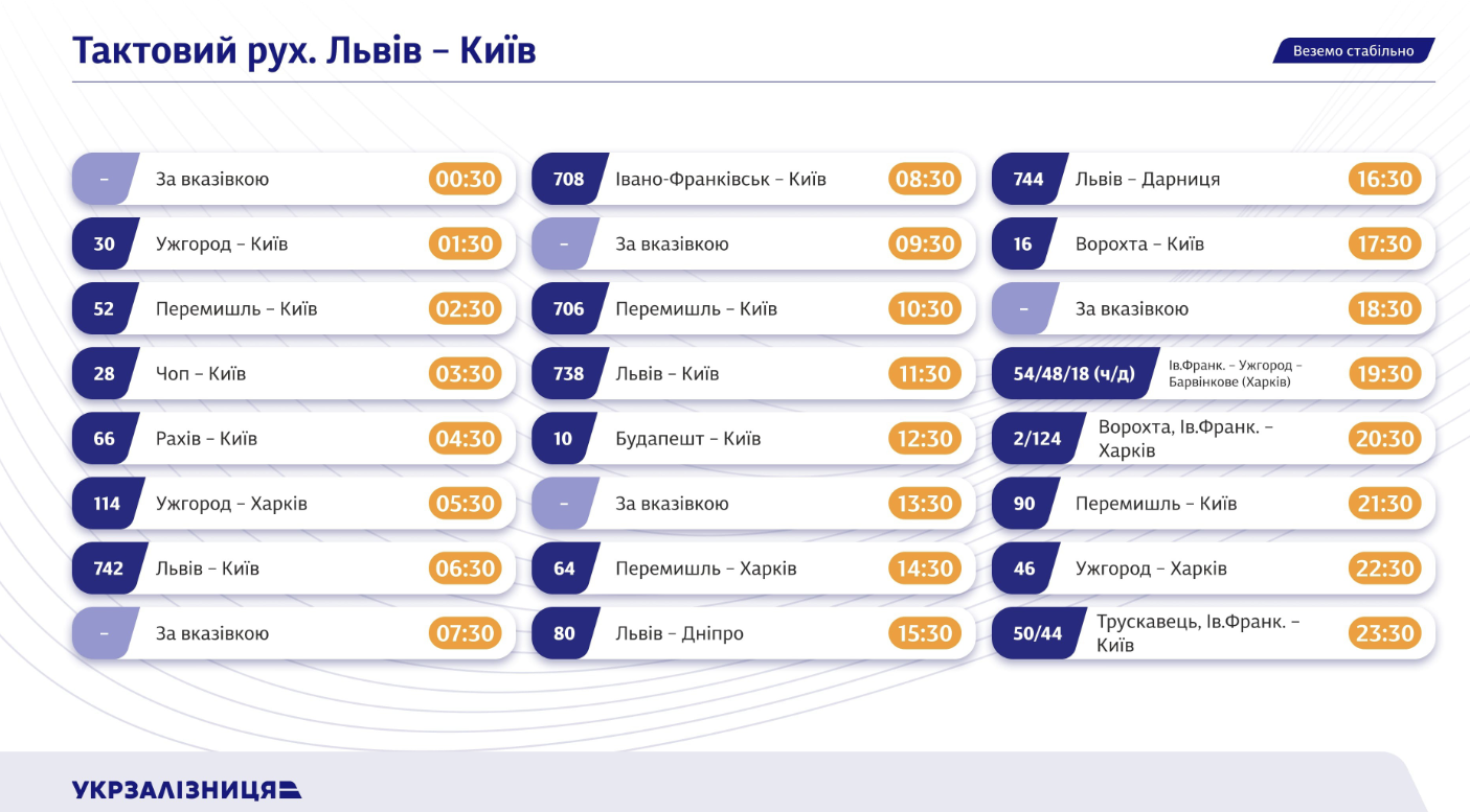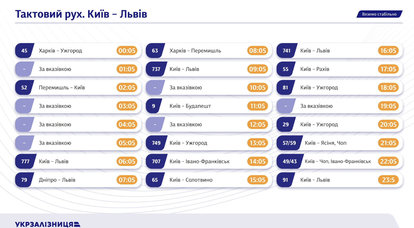 - Тактовий рух. З 14 грудня на найпопулярнішому напрямку Київ – Львів – Київ запроваджується тактовий рух: поїзди курсуватимуть щогодини за стабільним і повторюваним розкладом. Переважна більшість рейсів будуть цілорічними, з кількома виключеннями у позапіковий період.