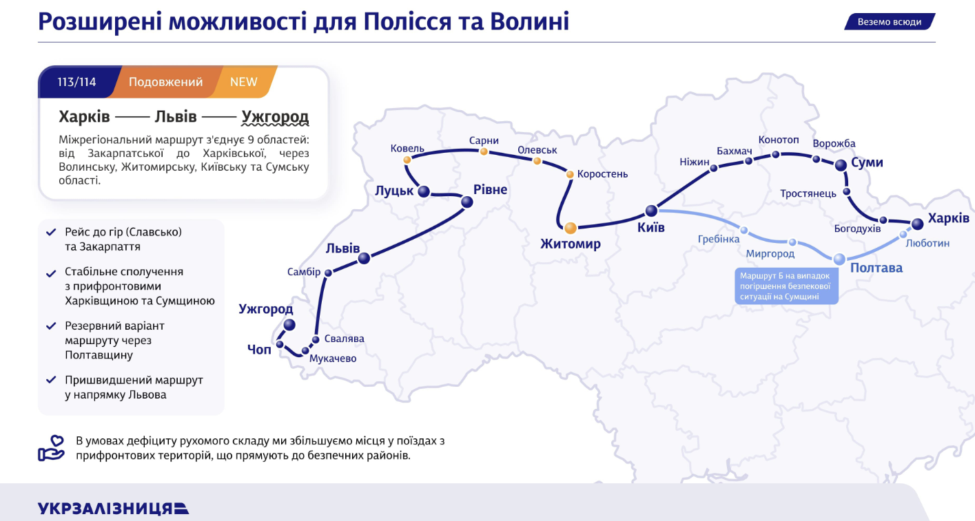 - Подовжений маршрут поїзда №113/114 Харків – Ужгород. Рейс тепер доходить до Закарпаття. Пряме сполучення для мешканців Житомира, Олевська, Сарн, Рафалівки та інших станцій маршруту до Славська й Ужгорода. Збережено сполучення з Харківщиною та Сумщиною.