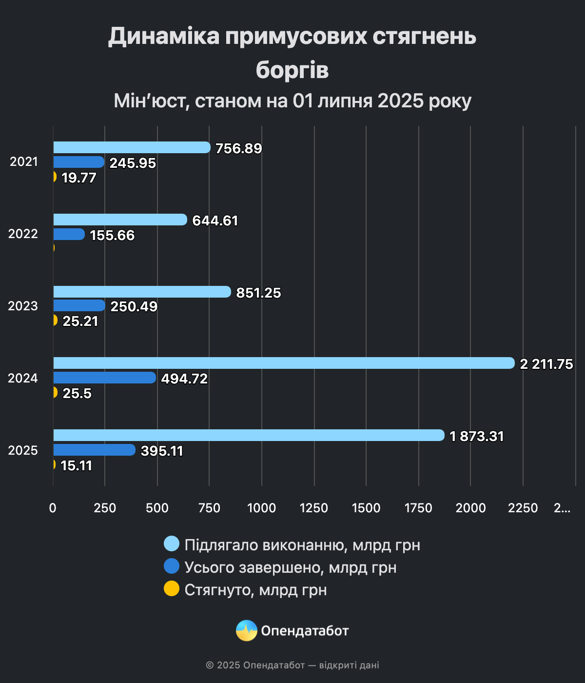 - З 5,3 млн проваджень 1,75 млн – це нові борги 2025 року, а 3,7 млн – борги, що перейшли з попередніх періодів. Загалом за пів року стягнуто 15,11 млрд грн, тоді як завершено проваджень на 395,11 млрд грн. Це означає, що багато справ закрили без фактичного повернення коштів, часто через відсутність у боржників майна, зазначає приватний виконавець Андрій Авторгов. Він додав, що завершення провадження не завжди означає повне виконання – частина справ закривається частково або повертається стягувачу через брак активів у боржника.