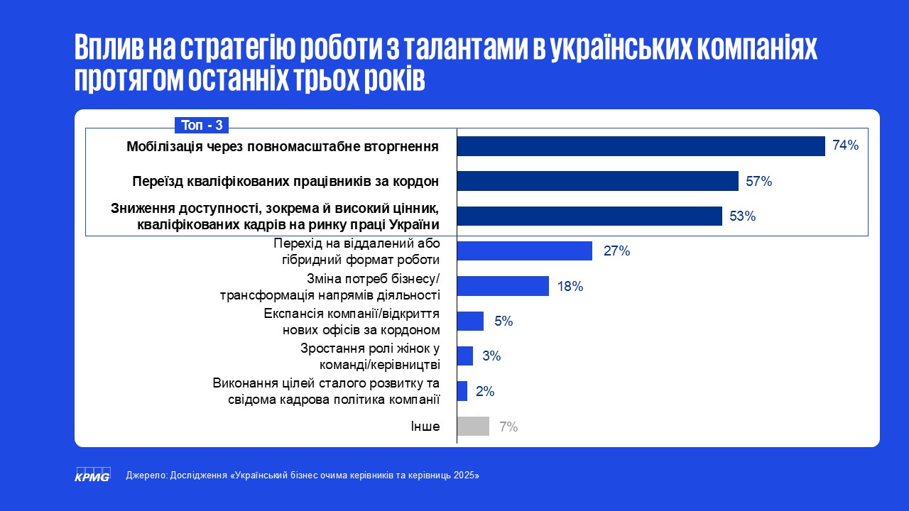 - Конкуренція за таланти зберігається на високому рівні: 74% компаній зазнали впливу мобілізації, а міграція та подорожчання кваліфікованих кадрів посилюють дефіцит персоналу. Демографічний тиск зростає: частка компаній, що відчувають критичний брак заміни через вихід працівників на пенсію, зросла з 15% до 25%.