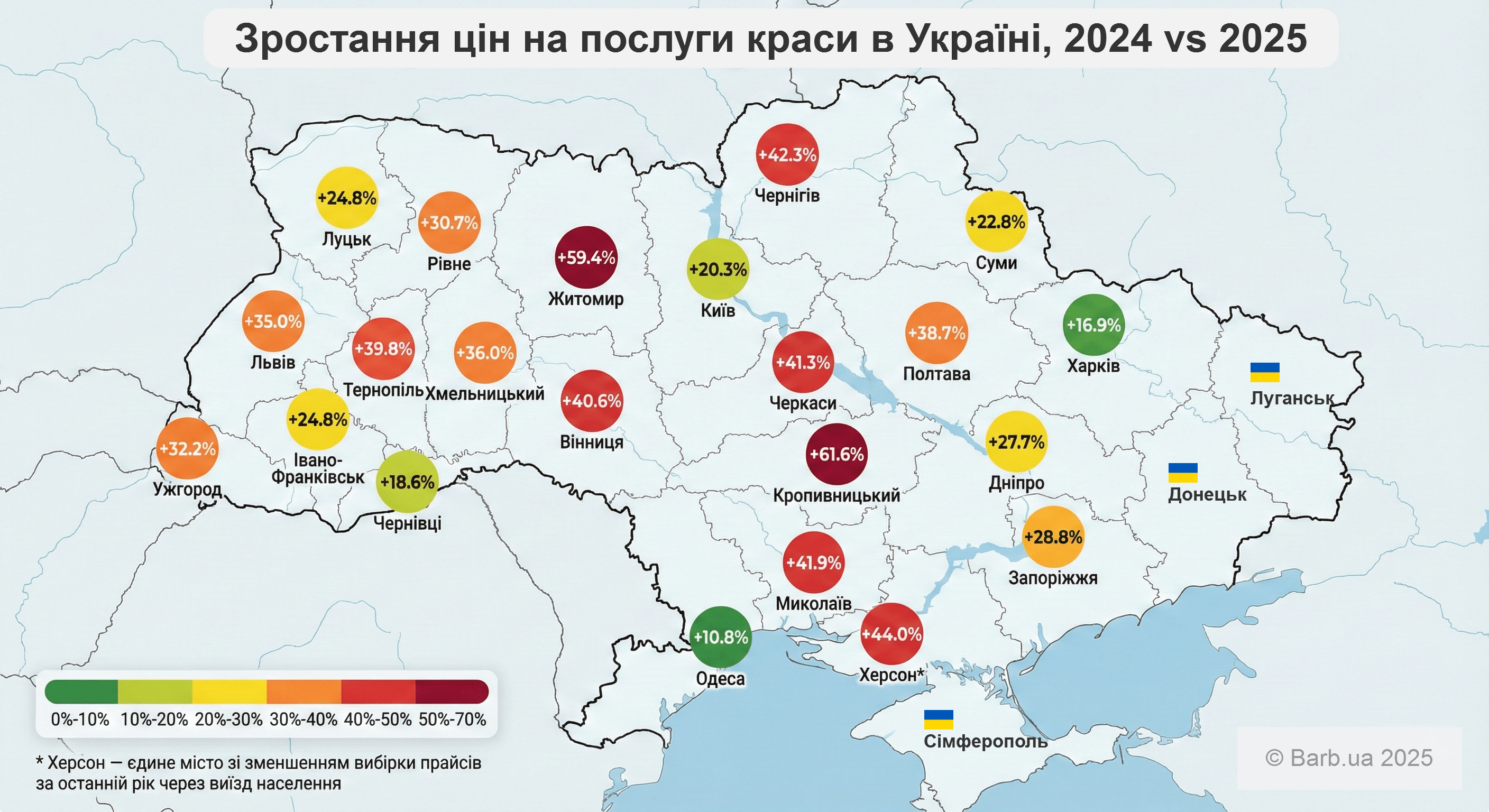- Найбільше зростання цін зафіксовано у центральних та північних областях. Лідером став Кропивницький (+61,6%), де подорожчали всі 15 досліджуваних послуг. Далі йдуть Житомир (+59,4%) і Херсон (+44%), однак дані по Херсону мають похибку через скорочення вибірки прайсів на 28% та масштабний відтік населення. До групи міст із високим зростанням (понад 40%) також увійшли Чернігів, Миколаїв, Черкаси та Вінниця. У Житомирі зафіксовано рекордне зростання вартості складного фарбування волосся – понад 120%.