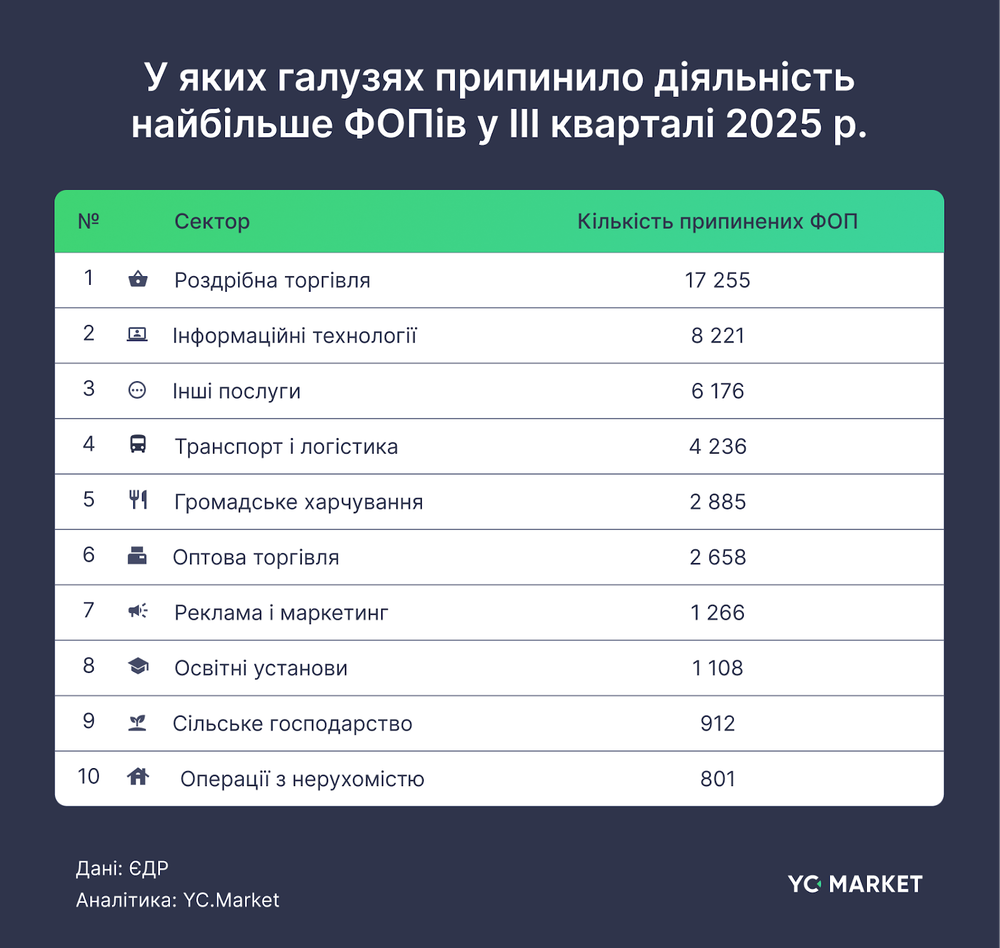 - Щодо припинень ФОП за галузями, ситуація в третьому кварталі краща, ніж рік тому, у більшості секторів. У ключових сферах кількість припинених ФОП зменшилася: торгівля – на 18,7%, оптова торгівля – на 17,4%. Зниження також у ІТ, транспорті, освіті та маркетингу.