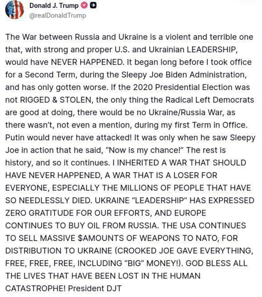 12:47 Трамп опублікував черговий допис у своїй соцмережі на тему мирного плану: «Чи справді можливий серйозний прогрес у мирних переговорах між Росією та Україною? Не вірте, доки не побачите, але, схоже, щось добре може статися. Боже, благослови Америку!».