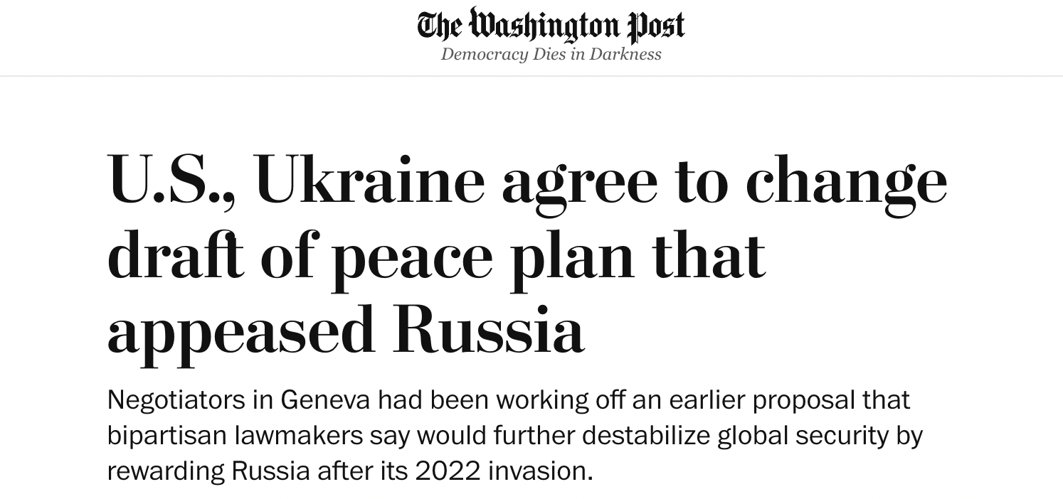 Запропонований США план перетинає кілька принципових «червоних ліній» України – серед них передача Росії частини Донецької області, обмеження чисельності української армії та заборона на вступ до НАТО. За даними європейських дипломатів, США також натякали Києву, що відмова від плану може поставити під загрозу американську військову та розвідувальну підтримку.