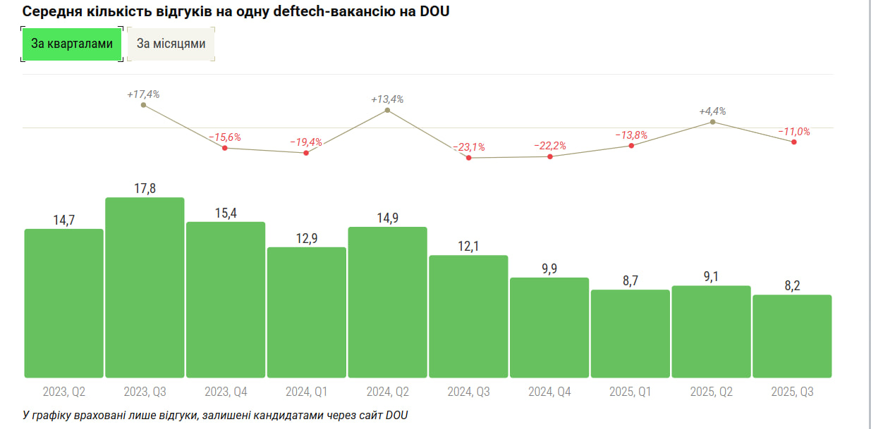 - Конкуренція за вакансії знижується: якщо у 2023 році на одну вакансію припадало 15–18 відгуків, то у 2025 році – 8–9. Найвищий показник був у третьому кварталі 2023 року (17,8 відгуків), а до третього кварталу 2025 року він знизився до 8,2.