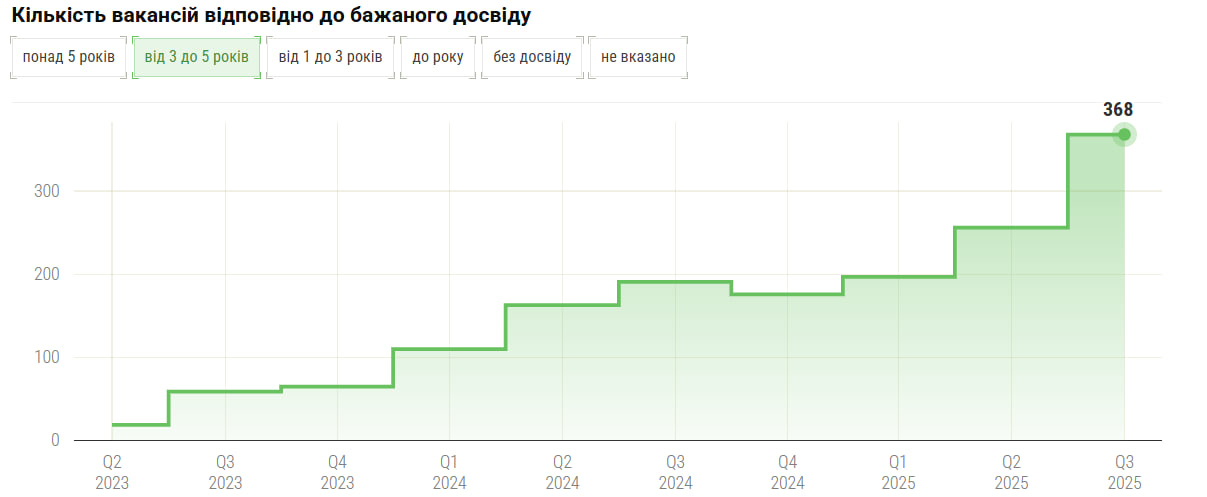 - Щодо досвіду, найбільше пропозицій 514 – для фахівців, що мають 1–3 роки роботи. Для кандидатів без досвіду доступно лише 33 вакансії, а для тих, хто має менше року досвіду, пропозицій більше, ніж для спеціалістів, що мають понад пʼять років. У 316 вакансіях вимоги до досвіду не вказані.