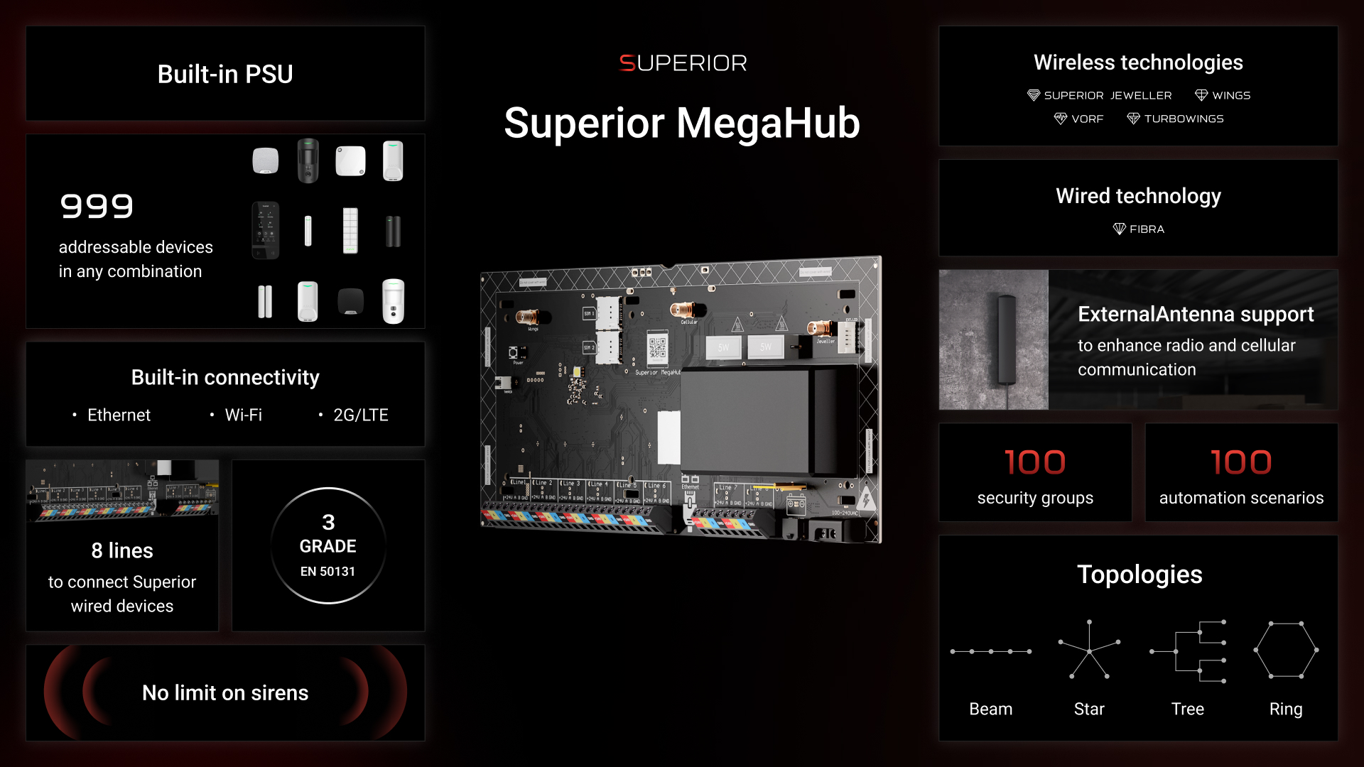 - Superior Hub Hybrid 2 – гібридна централь для великих об’єктів: до 250 пристроїв, Grade 3. Доступна з IV кварталу 2025 року.
