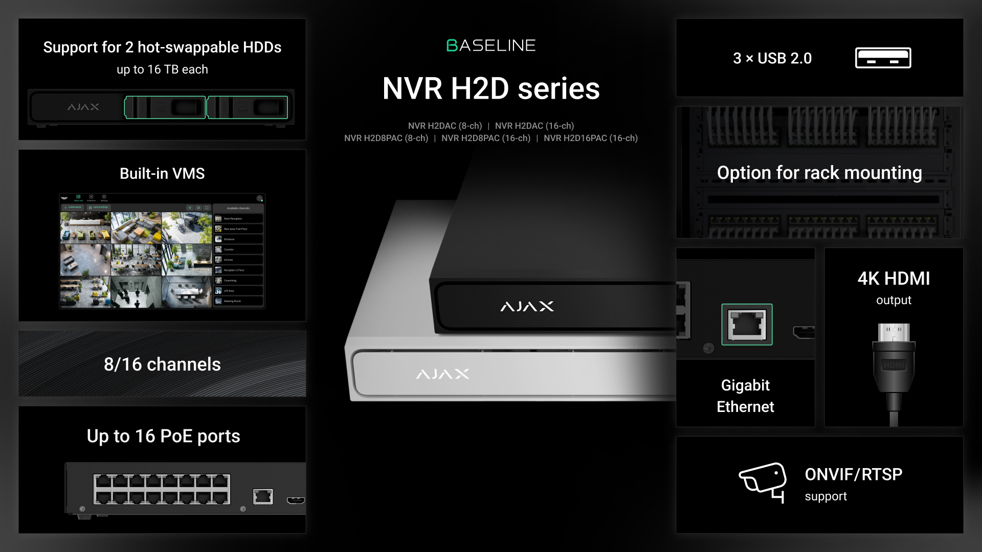 - Superior NVR – перші в лінійці Ajax мережеві відеореєстратори із вбудованим штучним інтелектом, який робить розумнішими навіть камери сторонніх виробників. Підтримують до 48 ТБ (2×24 ТБ), 32 канали та одночасне відтворення чотирьох 4K-потоків. У продаж з I кварталу 2026 року.