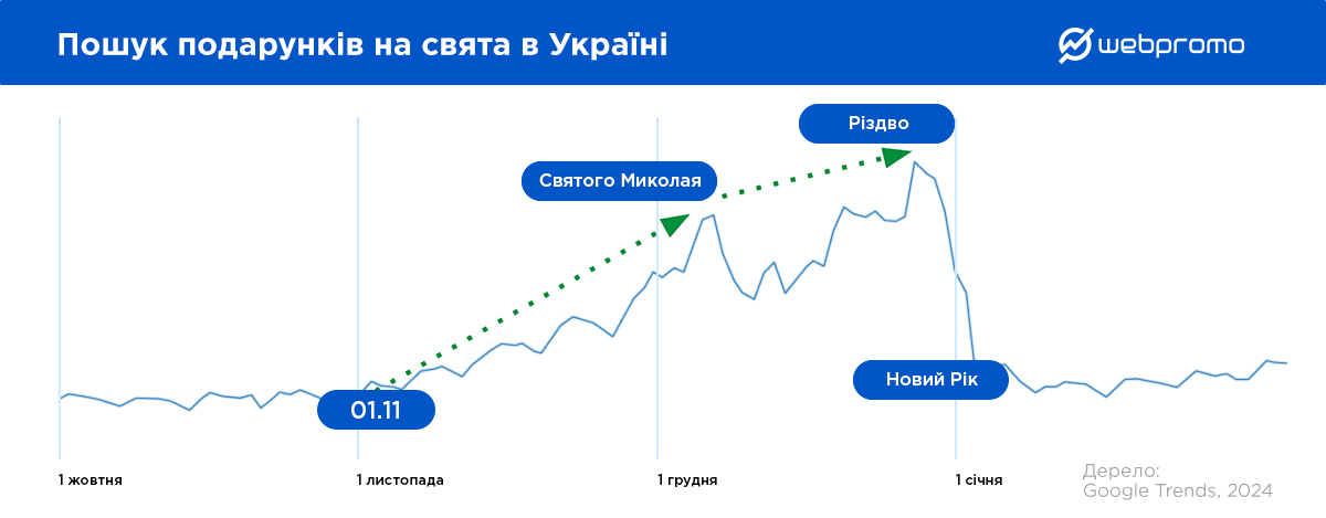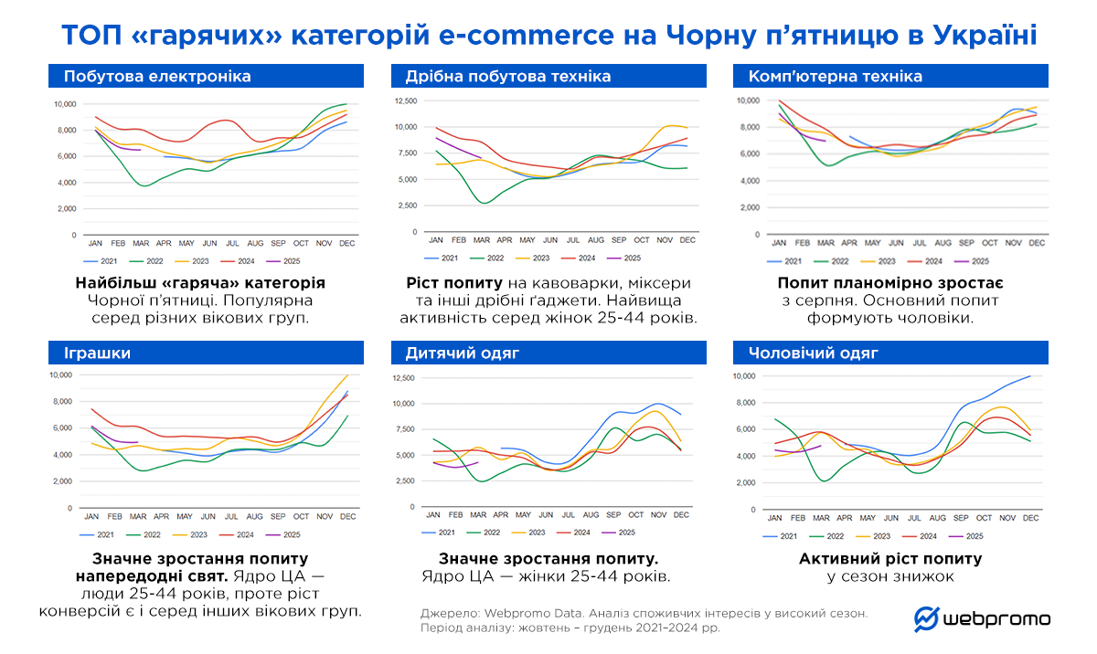 Дослідження ґрунтується на Webpromo Data – внутрішній аналітичній базі агенції Webpromo, яка акумулює показники ринку. Для глибокого аналізу поведінки та інтересів споживачів взято відповідний період високого сезону (жовтень – грудень) протягом 2021–2024 років. Також були використані інструменти Google Market Explorer та дані аналітичних агенцій, що досліджують український ринок.