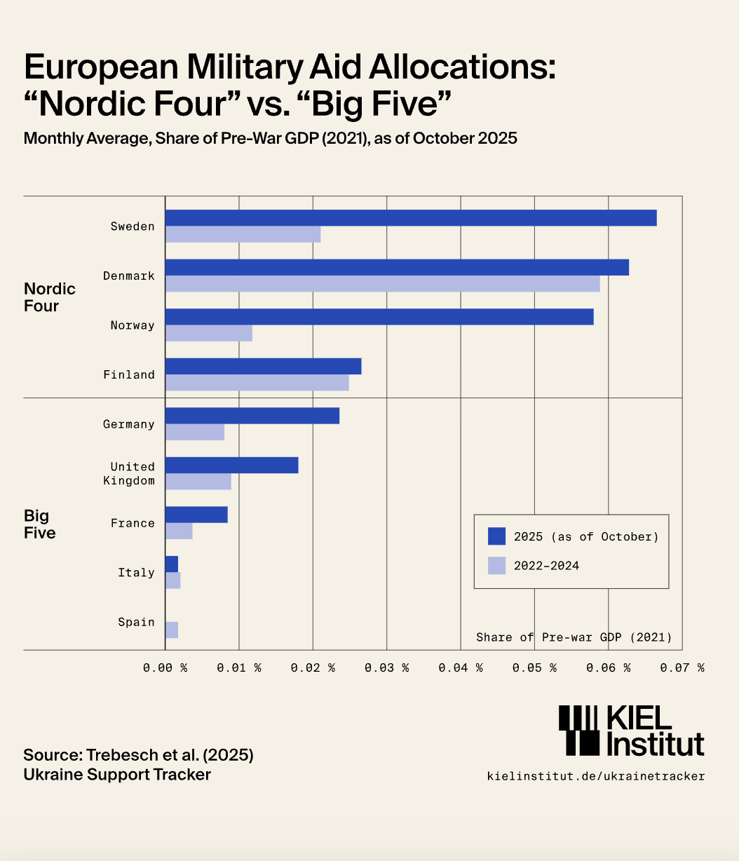 - Но даже эти показатели оставляют их позади скандинавских государств, если измерять взносы относительно ВВП. Чтобы достичь уровня Дании, Финляндии, Норвегии и Швеции, крупнейшим экономикам Европы пришлось бы значительно нарастить поддержку.