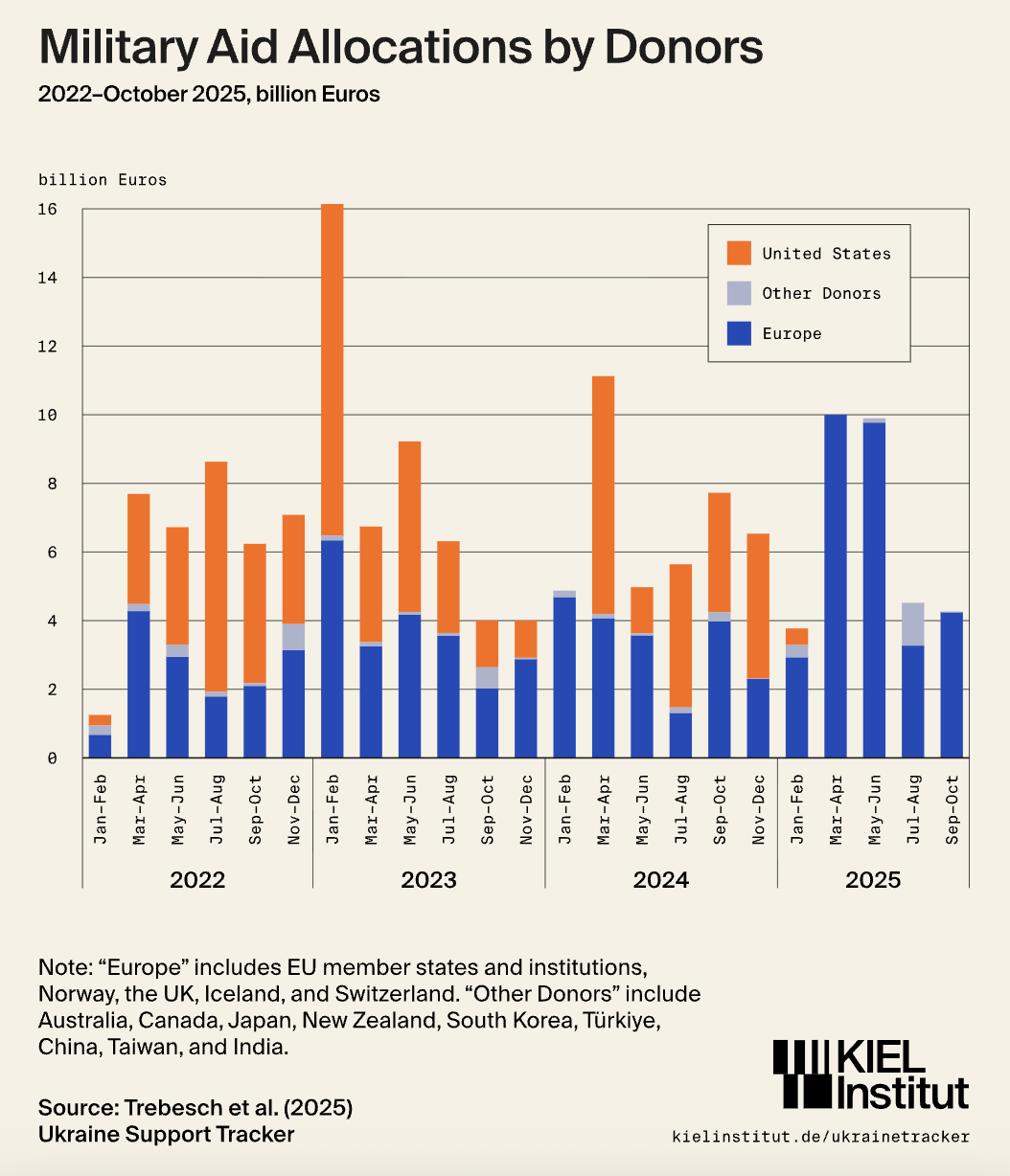 - По итогам сентября–октября тенденция к падению только усилилась: после рекордного первого полугодия темпы выделения средств резко снизились. На данный момент общая военная помощь в 2025 году составляет €32,5 млрд, тогда как в 2022–2024 годах ежегодные объемы в среднем достигали €41,6 млрд.
