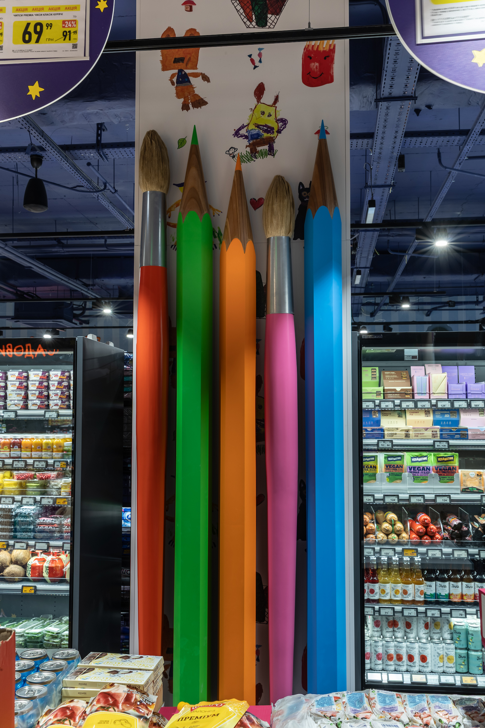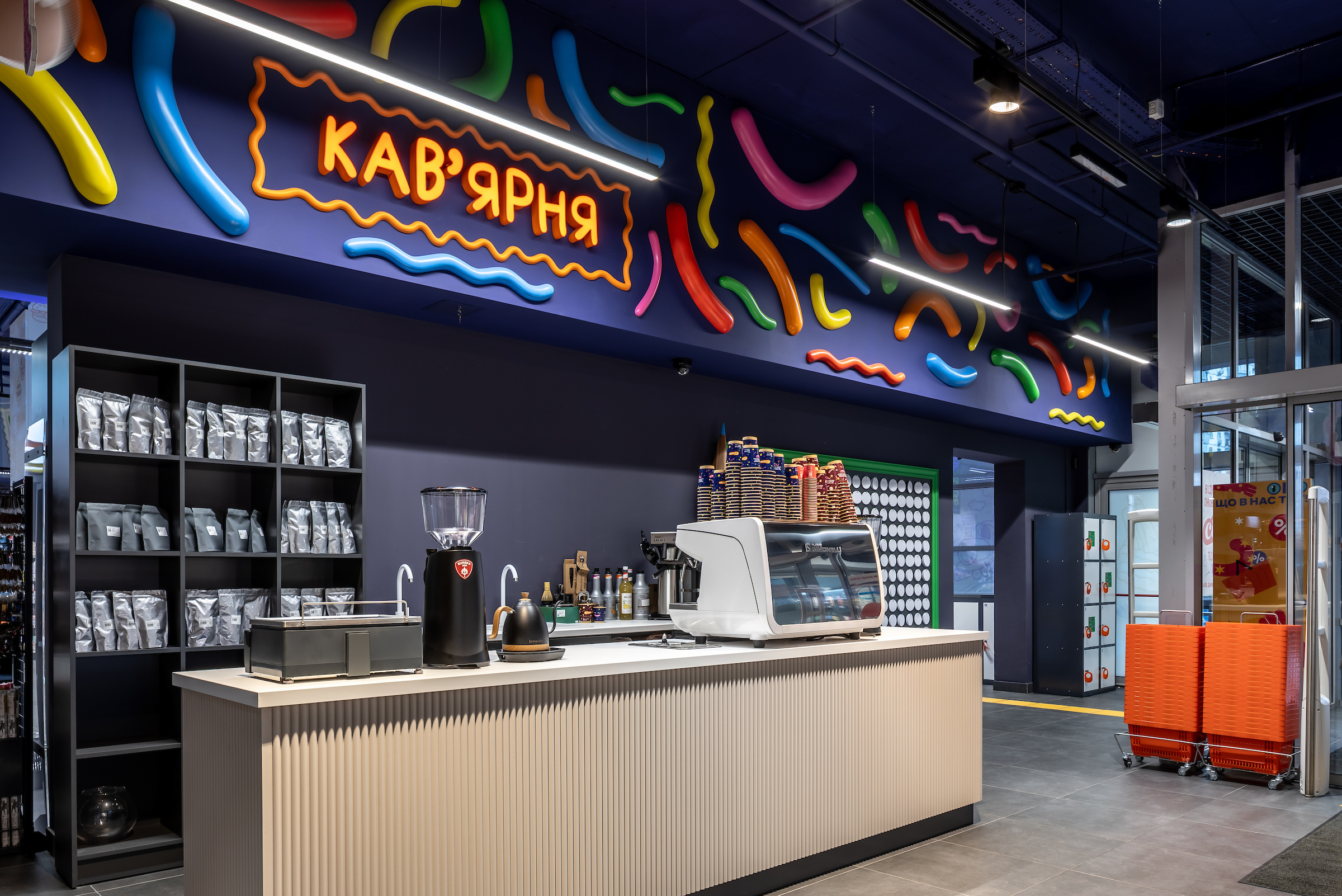 - В Киеве ритейлер открыл новый супермаркет в стиле RE-USE – с интерьером, созданным из повторно использованных материалов. Дизайн магазина на ул. Причальной, 14-А разработала KOSA art group при участии художницы Таши Оро: в пространстве размещены арт-объекты из оргтехники, металлических тележек, консервных банок, макулатуры, автоламп и одноразовой посуды. Магазин площадью 1254 м² работает ежедневно с 7:30 до 23:00.